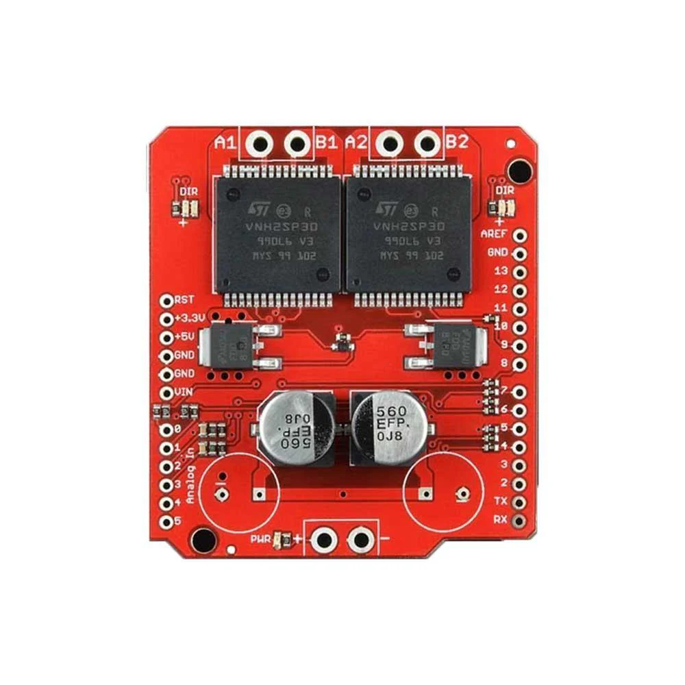 The Dual Monster Moto Shield VNH3ASP30 DC Motor Driver 2x14A (Peak 30A) is essentially a ramped up version of our Ardumoto motor driver shield. For this Monster Moto Shield, It is replaced the L298 H-bridge with a pair of VNH3ASP30 full-bridge motor drivers.